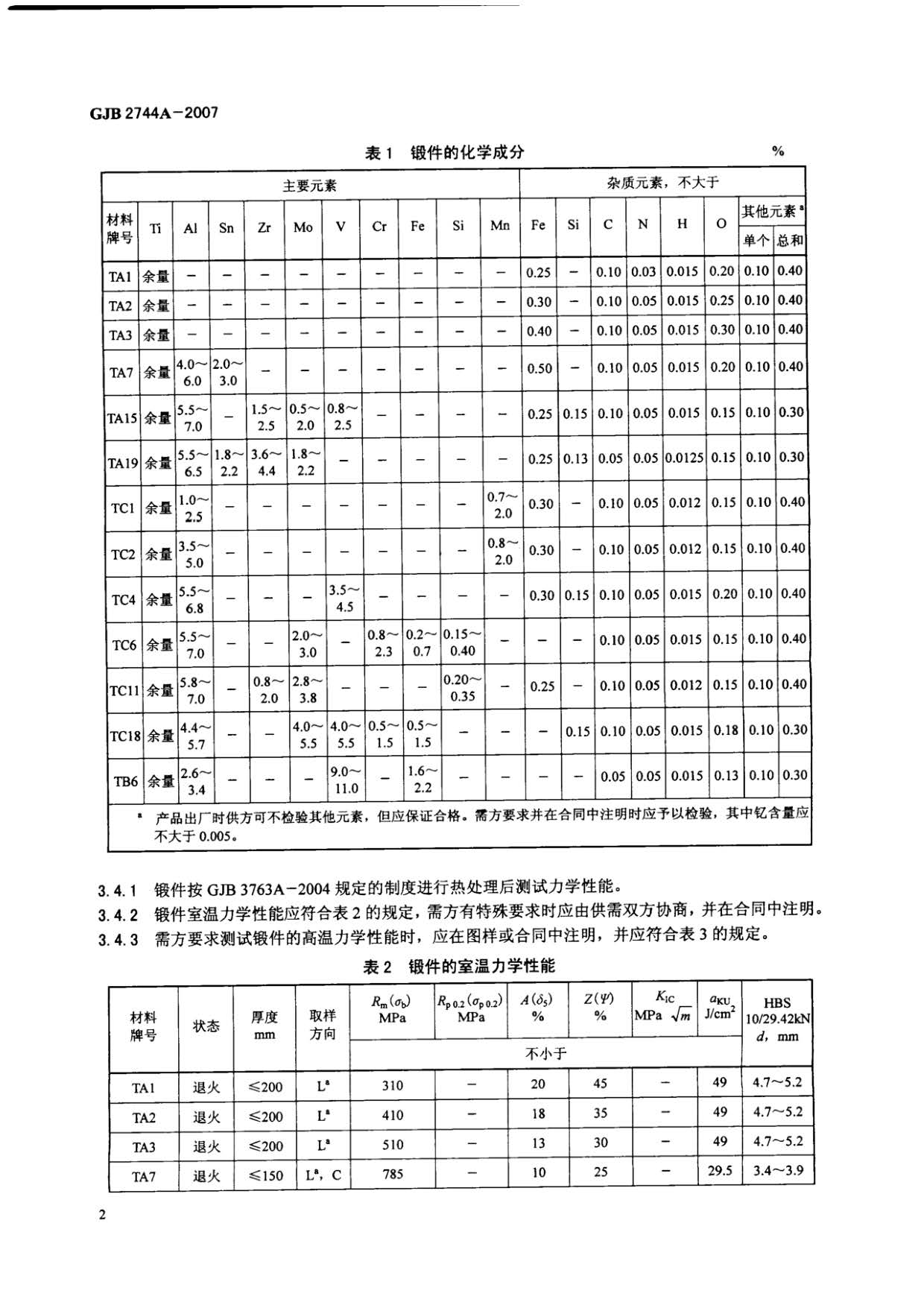航空用鈦及鈦合金鍛件規范 GJB 2744A-2007,規定了TA1、TA2、TA3、TA7、TA15、TA19、TC1、TC2、TC4、TC6、TC11、TC18、TB6鈦及鈦合金自由鍛件和模鍛件(以下簡稱鍛件)的要求,質量保證規定和交貨準備等。